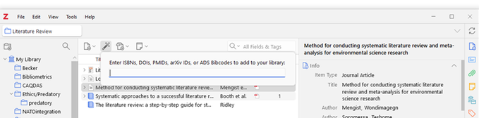 Lägg till referenser med identifierare: Du kan enkelt lägga till en referens med hjälp av dess ISBN, DOI eller PMID. I Zotero klicka på ”trollstaven”. Skriv in identifieraren och tryck enter.