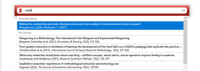 Lägga till en referens: Välj add citation för att infoga referensen i texten. Du ombeds nu söka fram referensen från ditt bibliotek. Välj en eller flera och tryck sedan enter för att infoga.