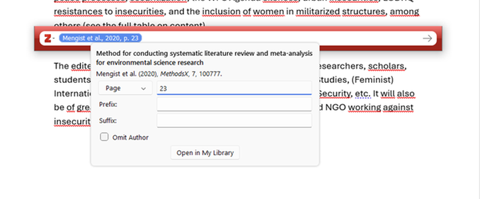 För att lägga till siduppgifter: markera den referens du vill lägga till siduppgfiter på. Trycker ”add/edit citation” och tryck på referensen i rutan som dyker upp så får du fram ytterligare alternativ. Lägg in ”pages”.