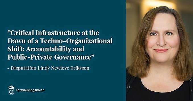 Den 28 mars försvarar Lindy Newlove-Eriksson sin avhandling ”Critical Infrastructure at the Dawn of a Techno-Organizational Shift: Accountability and Public-Private Governance”.