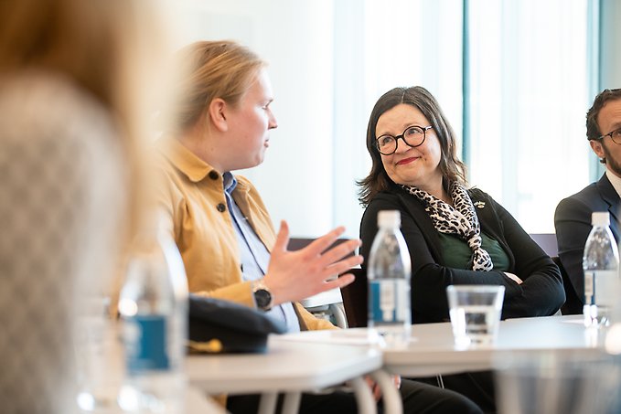 Utbildningsministern i samtal med studenter på masterprogrammet Politik, säkerhet och krig