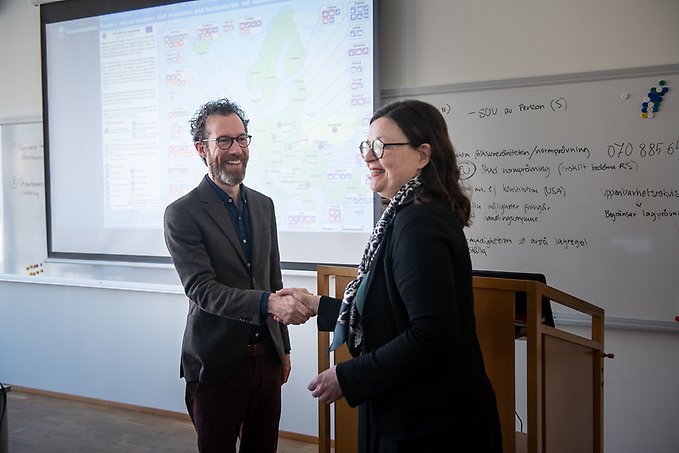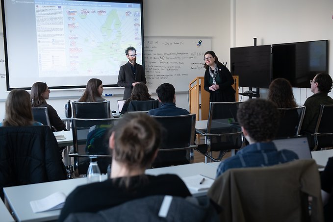 Därefter var det dags för ett besök hos en grupp studenter som just nu går kursen Europeisk säkerhet och krishantering som är en del av internationella masterprogrammet Politik, säkerhet och krig med inriktning statsvetenskap. Dagens seminarieledare var docent Simon Hollis, som är studierektor på programmet och forskar på krishantering, internationell samverkan och samhällets motståndskraft mot kriser.