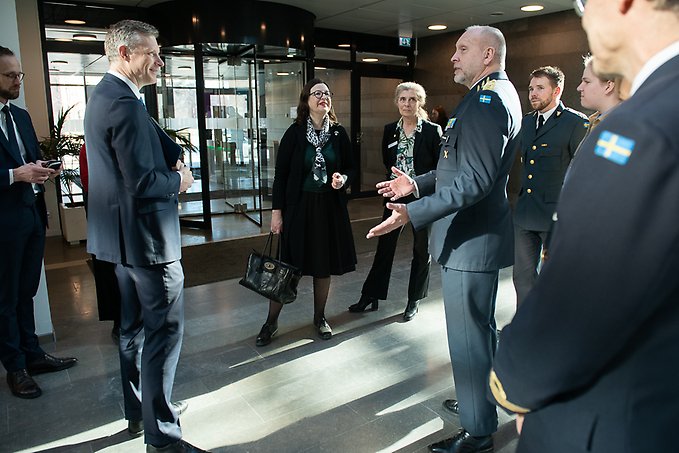 Vid ankomsten till Försvarshögskolan välkomnandes utbildningsministern tillsammans med politiskt sakkunniga Ebba Ringborg och handläggare Andreas Bokerud av rektor Robert Egnell med övriga högskoleledningen och studentkårsrepresentanter.