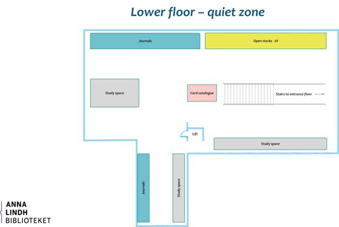 Sketches of the premises with resources in the main library at Drottning Kristinas Väg. Click on the links for large images.