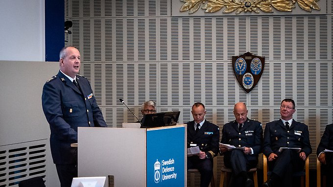 Nya kursdeltagare på Högre officersprogrammet står i givakt inför tjänsteförättande vicerektor Hans Granlunds välkomstanförande.