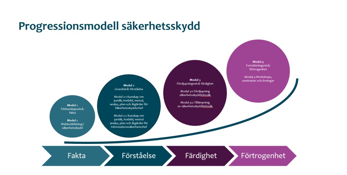 Försvarshögskolan har tagit fram ett utbildningskoncept som både innehållsmässigt och målgruppsanpassat förmedlar en utveckling i progression från en grundläggande förkunskapsnivå, där du som deltagare utvecklar faktakunskap genom att gå igenom grundläggande säkerhetsskydd till en avancerad nivå där förtrogenhet med säkerhetsskydd uppnås i tillämpningen.
